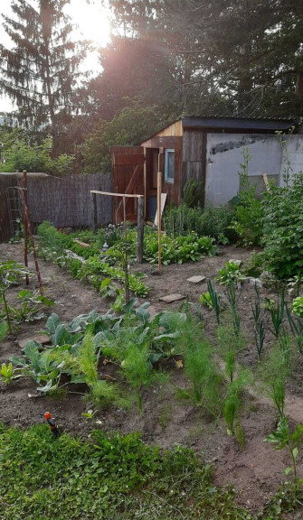 Der Garten ist in 3 Ebenen unterteilt und besteht aus einem Hühnerstall mit Auslauffläche und Altbaumbestand (Apfel, Birnen, Zwetschken und vielem mehr...) einem Gemüsegarten und einer Grünfläche.