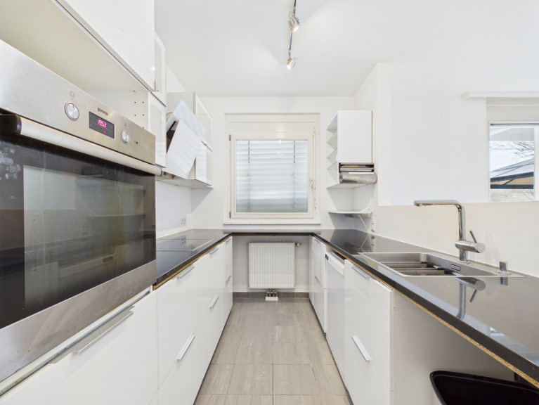 Gleich rechts vom Eingang befindet sich das separate Gäste-WC, sodass die Privatsphäre in den übrigen Wohnräumen stets gewahrt bleibt. Der Vorraum führt Sie weiter in den weitläufigen, offen gestalteten Wohn- und Essbereich. Dieser bildet das Herzstück der Wohnung und bietet viel Raum für eine großzügige Sofalandschaft und einen gemütlichen Essplatz. Die Küche ist geschickt in einer eigenen Nische untergebracht, was für eine klare optische Trennung sorgt, während das offene Wohnkonzept erhalten bleibt.