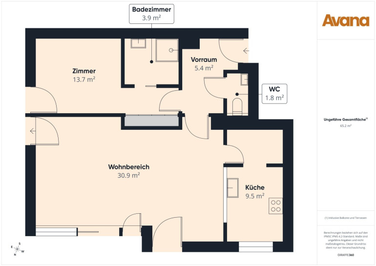 - Separate Sanitärräume: Gäste-WC (ca. 1,83 m²) getrennt vom Hauptbad.