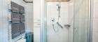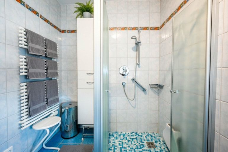 - Badezimmer mit Dusche, Waschtisch, Handtuchtrockner, Waschmaschinenanschluss und Fenster zum Lüften