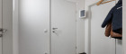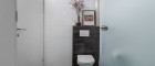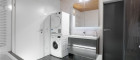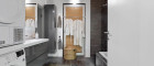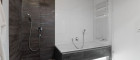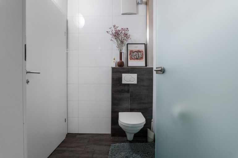 Das Badezimmer verfügt über eine Badewanne und eine Dusche. Ein separates WC und ein Abstellraum sorgen für zusätzlichen Komfort.