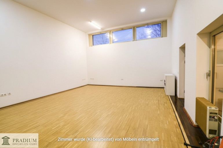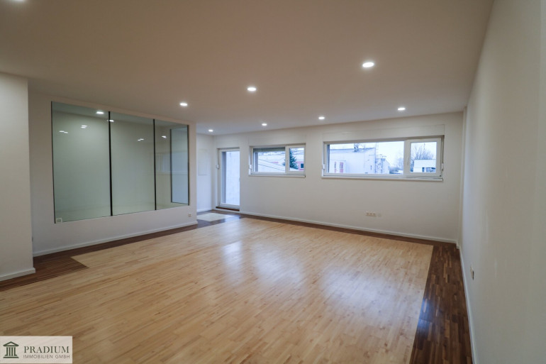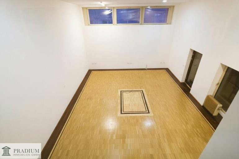 Diese besondere Einheit kombiniert Büroflächen mit einem außergewöhnlichen Saalraum: