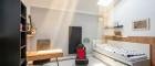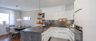 Die EWE-Küche ist funktional und hochwertig ausgestattet und verfügt über eine Holzarbeitsplatte, Induktionskochfeld sowie Markengeräte von Bosch und Siemens.