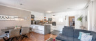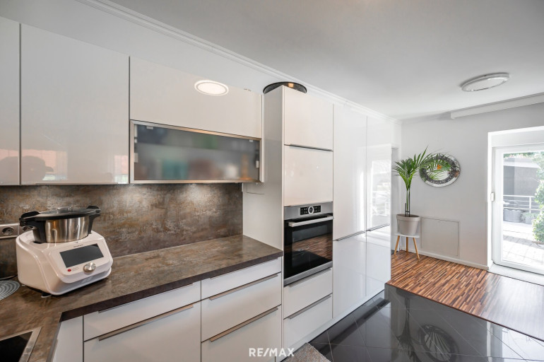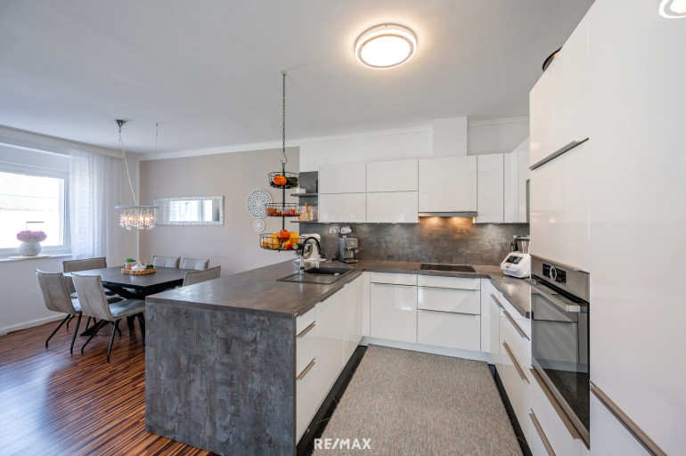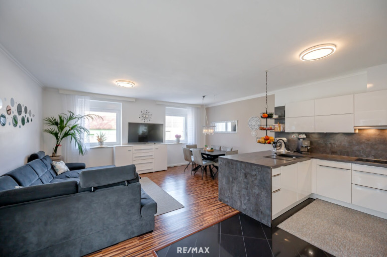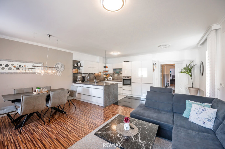Der offene Wohn- und Essbereich mit angeschlossener Küche bildet das Herzstück des Hauses und überzeugt durch Helligkeit, eine angenehme Raumwirkung sowie einen hochwertigen, neu verlegten Parkettboden.