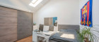 sowie ein Master-Bedroom mit Blick in den Garten und angeschlossenem Schrankraum.