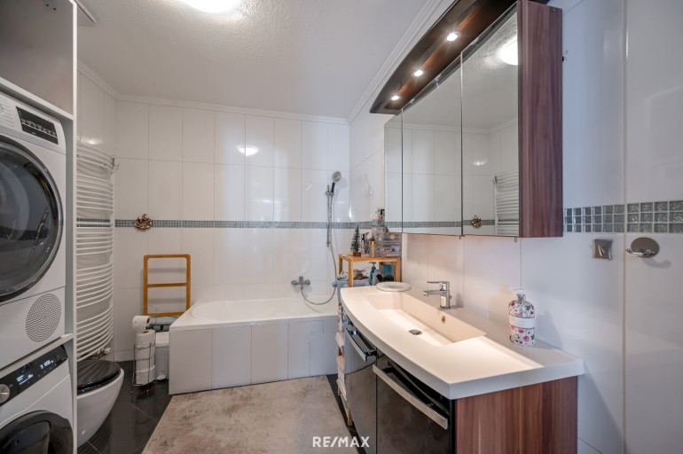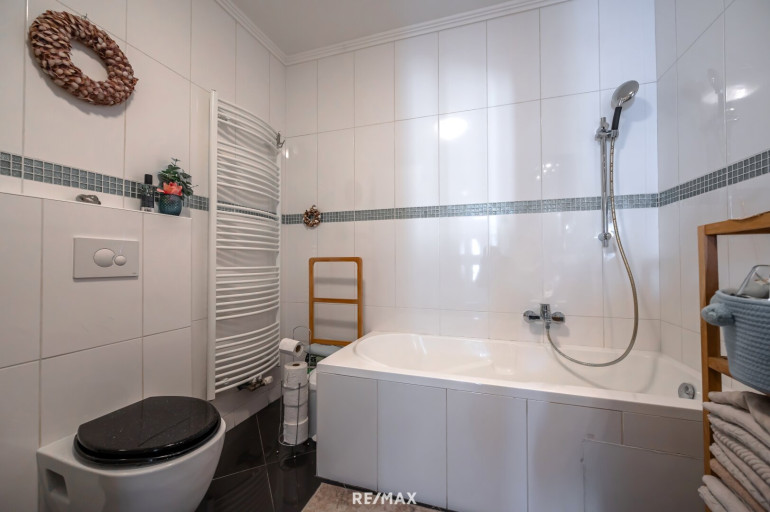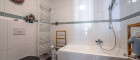 Das Badezimmer ist komfortabel ausgestattet mit Badewanne, Dusche, WC und Waschbecken sowie einem Waschmaschinenanschluss.