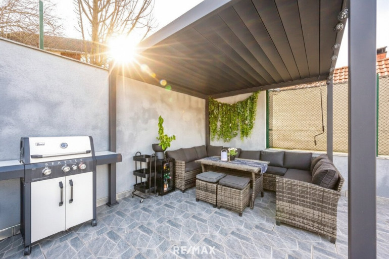 Die Pergola mit Terrasse schafft einen idealen Platz für gemeinsame Mahlzeiten, Grillabende oder gemütliche Sommerabende mit Familie und Freunden.