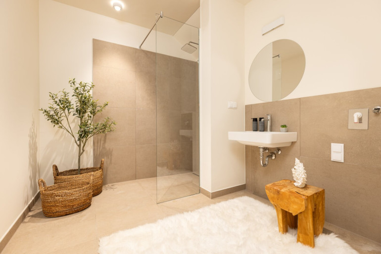 - Hochwertige Oberflächen wie Eichenparkett und 60×60 cm Feinsteinzeugfliesen