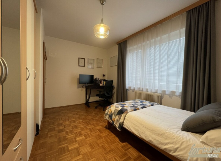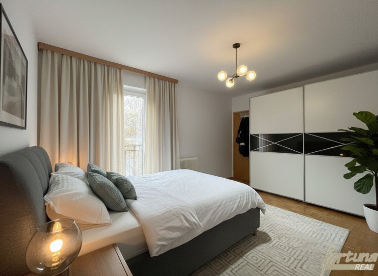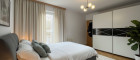 Das Schlafzimmer verfügt über ein großes, bis zum Boden reichendes Fenster mit Südausrichtung, das für eine besonders helle und freundliche Atmosphäre sorgt.