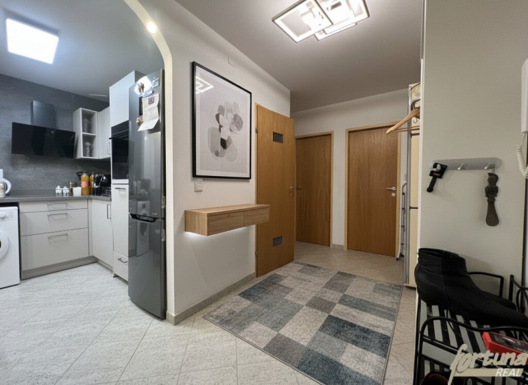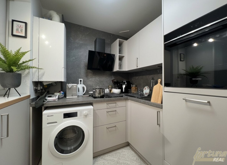 Die neue Küche verfügt über eine Einbauküche mit guten Arbeits- und Staumöglichkeiten. Über eine Durchreiche mit Glasschiebefenster ist sie mit dem Wohnzimmer verbunden, wodurch eine angenehme Verbindung zwischen Kochen und Wohnen entsteht. In der Küche befindet sich außerdem der Anschluss für eine Waschmaschine.