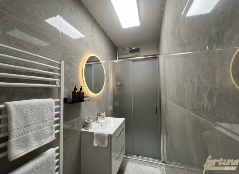 Das Badezimmer ist neu und mit einer Dusche sowie einem Waschbecken ausgestattet. Zusätzlich befindet sich im Badezimmer ein Handtuchheizkörper, der für angenehmen Komfort sorgt.
