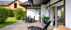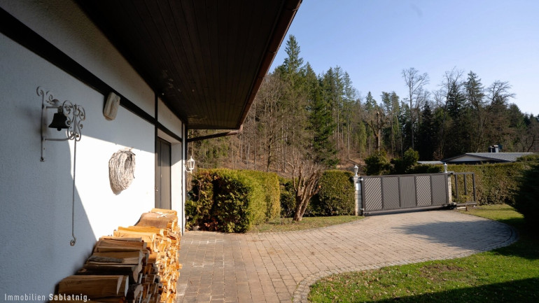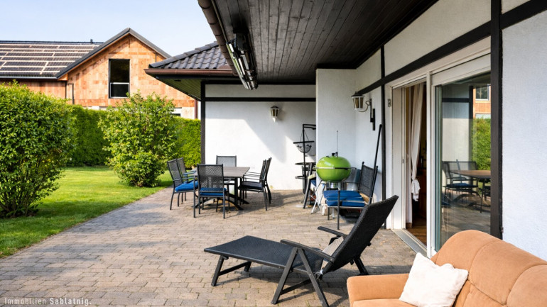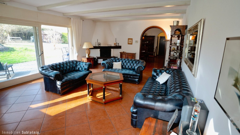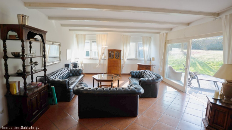 Die Südwest-Terrasse lädt zum Verweilen und Entspannen ein. Von hier genießt man einen wunderschönen Blick ins Grüne sowie auf den großzügigen Swimmingpool mit begehbarer Überdachung, der nahezu wetterunabhängig genutzt werden kann und den Freizeitwert dieser Liegenschaft deutlich erhöht.