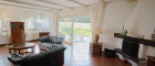 Der offene Wohn- und Essbereich bildet das Herzstück des Hauses. Große Fensterflächen, stilvolle Terrakottafliesen und der direkte Zugang zur Terrasse schaffen eine besonders warme und einladende Wohnatmosphäre. Der Wohnbereich präsentiert sich außergewöhnlich großzügig und bietet herrliche Grünblicke in den Garten. Ein Kamin im Wohnbereich sorgt zusätzlich für eine besonders angenehme Wohnatmosphäre und unterstreicht den behaglichen Charakter dieses großzügigen Raumes.