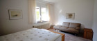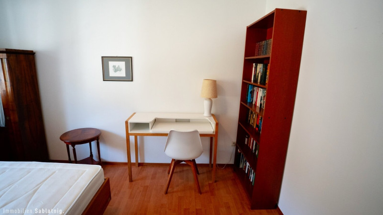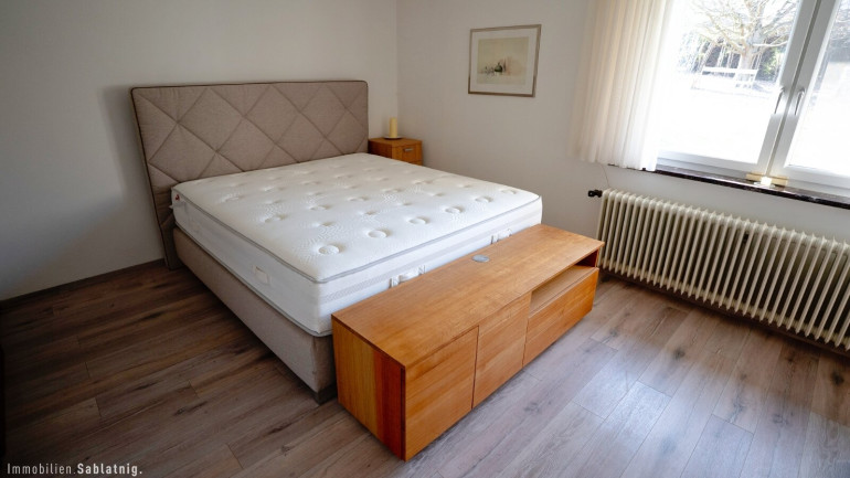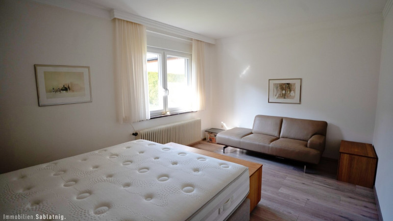 Vom zentral gelegenen Essbereich erschließen sich die weiteren hellen Räumlichkeiten des Hauses. Über einen Zwischenbereich gelangt man in den ruhig gelegenen Schlafbereich mit einem großzügigen Schlafzimmer sowie einem weiteren Zimmer, das derzeit als Ankleide genutzt wird. Ein weiteres sehr geräumiges und lichtdurchflutetes Schlafzimmer ergänzt die durchdachte Raumaufteilung.