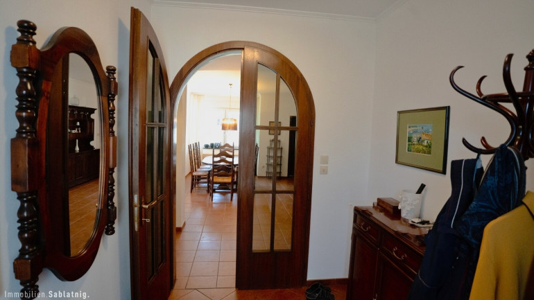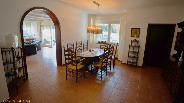 Bereits beim Betreten des Hauses entsteht ein besonderer erster Eindruck. Das Entrée öffnet sich unmittelbar zu einem beeindruckend großzügigen Essbereich, der als zentraler Mittelpunkt des Hauses gestaltet ist. Von hier aus entsteht eine harmonische Blickführung durch den gesamten Wohnbereich bis hinaus in den Garten, wodurch sofort ein Gefühl von Weite, Licht und Offenheit entsteht.