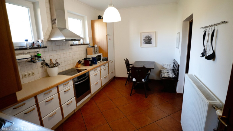 Die geräumige Küche bietet neben viel Arbeitsfläche auch einen gemütlichen Essbereich mit Eckbank sowie eine großzügige Speisekammer, die zusätzlichen Stauraum schafft.