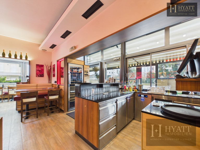 Das Geschäftslokal verfügt über eine Nutzfläche von rund 160 m² und erstreckt sich über zwei Ebenen. Im Erdgeschoss befindet sich ein großzügiger Gastraum mit integrierter Küchen- bzw. Barfläche sowie ein heller Wintergarten, der für eine angenehme Atmosphäre sorgt. Ergänzt wird dieser Bereich durch eine großzügige überdachte Terrasse mit ca. 44 m², die zusätzlichen Platz für Gäste bietet und besonders in den Sommermonaten ein attraktives Highlight darstellt.