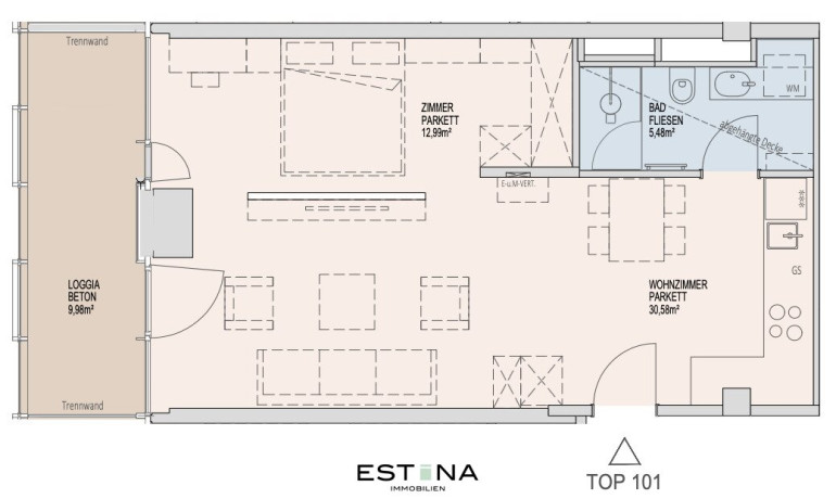 Fliesen, Parkett, Einbauküche, Personenaufzug, Nordbalkon, Dusche