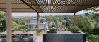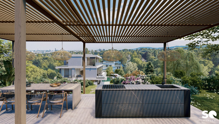 Ein besonderes Highlight bietet die höher gelegene Pergola mit Outdoor-Küche und Ess- bzw. Partybereich. Von hier aus genießt man einen fantastischen Ausblick – weit über die Villa und das Anwesen hinaus, über die umliegenden Grundstücke hinweg, bis weit über die Dächer Wiens.