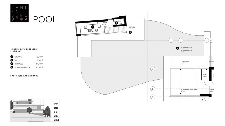 Das 3,000 m² große Grundstück grenzt unmittelbar an ein Naturschutzgebiet. Während die leichte Hanglage vielseitige Möglichkeiten in der Landschaftsgestaltung bietet, schafft der Naturpool im Garten ein ausgewogenes Mikroklima. Für die vielseitige Nutzung ist das Außenbecken mit dem Indoor-Pool verbunden. Zum Schutz der Privatsphäre ist das Anwesen weiters durch große Pflanzen der weitläufigen – nach Süd/Südwest ausgerichtet Gartenanlage – geschützt.