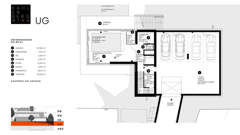 Die großzügige Garage im Untergeschoss der Villa bietet Platz für 4 PKW und ist direkt von der Kahlenberger Straße per Zufahrt zugänglich. Ebenso der einladend gestaltete Haupteingang.