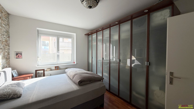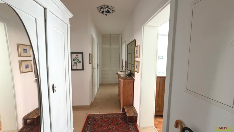 Die Wohnung verfügt über eine Wohnfläche von rund 66 m² und überzeugt mit einer stimmigen, alltagstauglichen Raumaufteilung. Vom Vorraum aus sind die Räume zentral erschlossen. Zur Verfügung stehen ein Wohnbereich, eine Küche mit Essplatz, zwei weitere Zimmer, ein Badezimmer sowie ein separates WC. Der Wohnbereich wirkt durch die große Glasfläche angenehm hell und bietet einen direkten Übergang auf die westseitige Terrasse und weiter in den Garten. Die beiden weiteren Zimmer präsentieren sich freundlich und gut nutzbar, wobei eines davon durch die markante Wandgestaltung einen besonders wohnlichen Charakter erhält. Ergänzt wird das Angebot durch ein Kellerabteil mit ca. 5 m² sowie einen Garagenplatz.