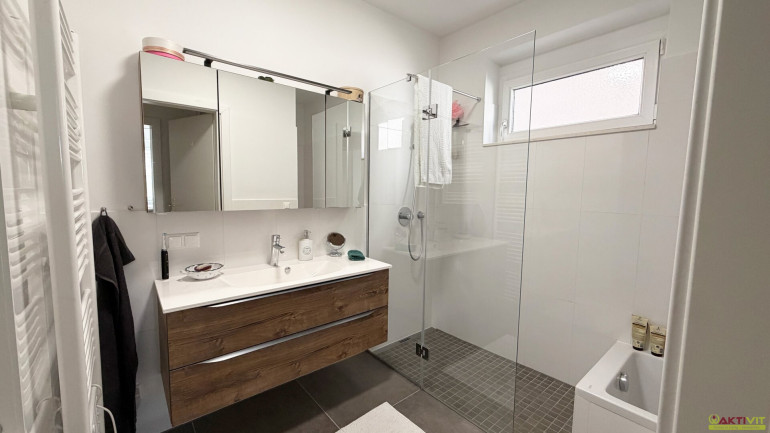 Die Wohnung befindet sich in einem Neubau in Massivbauweise und präsentiert sich in sehr gepflegtem Zustand. Ausgestattet ist sie mit Fliesen- und Parkettböden, einer modernen Einbauküche sowie Badmöblierung. Besonders hervorzuheben ist die helle Küche mit klarer Linienführung, viel Stauraum und gut integriertem Essbereich. Auch das Badezimmer vermittelt einen sehr gepflegten und zeitlosen Eindruck; es verfügt über ein Fenster, eine Badewanne, eine Dusche und einen großzügigen Waschtisch. Rollläden sowie Kabel- bzw. Satelliten-TV ergänzen die Ausstattung sinnvoll.