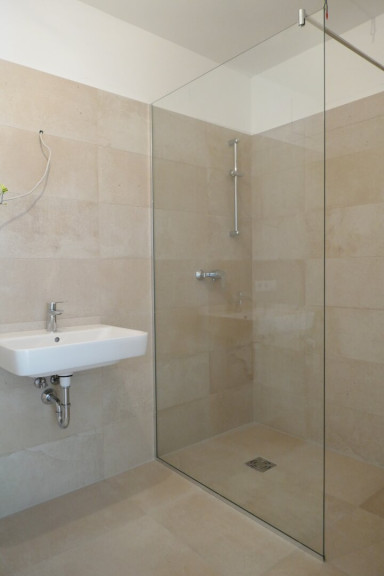 - Großformatige Fliesen in den Sanitärbereichen