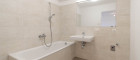 Das Badezimmer verfügt über eine Badewanne, ein Waschbecken sowie einen Anschluss für die Waschmaschine. Ein separates WC rundet das Angebot ab.