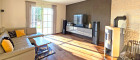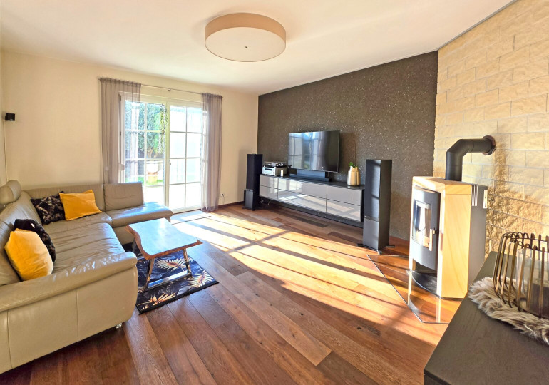 Das Erdgeschoss präsentiert sich modern und einladend. Der Wohnbereich wurde hochwertig erneuert und mit einem edlen Vollholzboden aus dunkler Eiche ausgestattet. Für eine besonders gemütliche Atmosphäre sorgt ein stilvoller Specksteinofen der Marke RIKA.