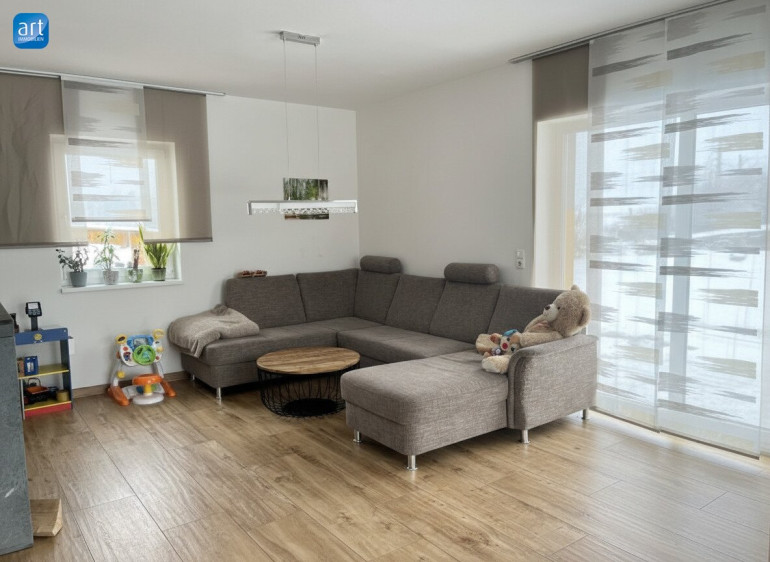 Dieses ansprechende Haus bietet Ihnen einen großzügigen, offenen Wohnbereich, der ideal für gesellige Abende mit Familie und Freunden geeignet ist. Vom Wohnzimmer mit Kamin gelangen Sie auf die überdachte Terrasse, die zum Entspannen einlädt. In der modernen Küche (mit Terassentür) ist ein gemütlicher Essbereich integriert.