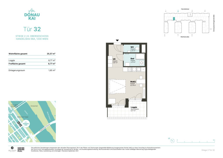 - öffentliche Anbindung: U6 & S-Bahn (Handelskai) sowie auch die Buslinien 5A & 11A