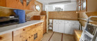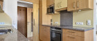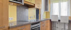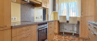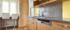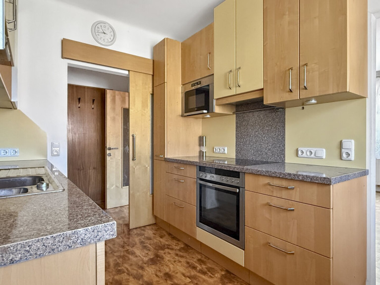 Die Küche ist sowohl vom Wohnzimmer als auch vom Eingangsbereich aus erreichbar und fügt sich praktisch in die Raumstruktur ein. Von der Küche aus gelangt man in das Badezimmer, das mit einer Badewanne ausgestattet ist.