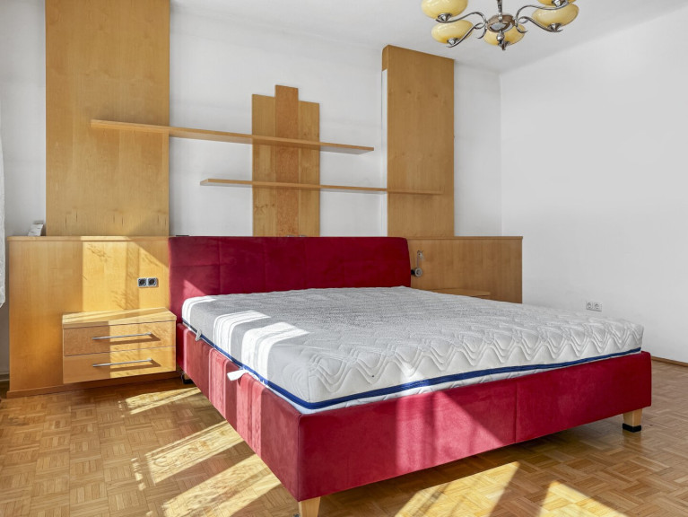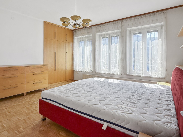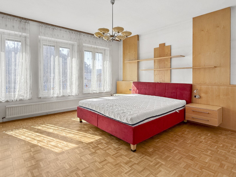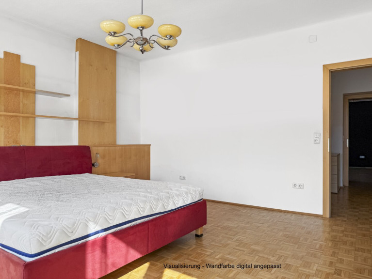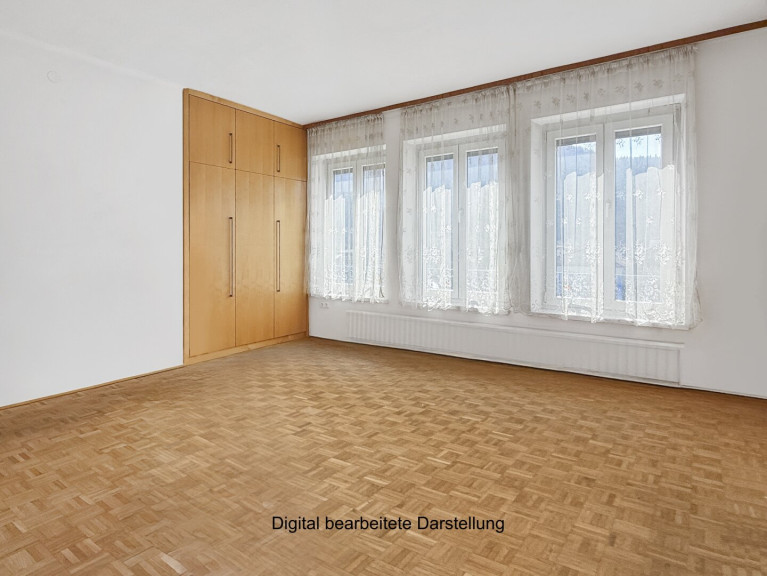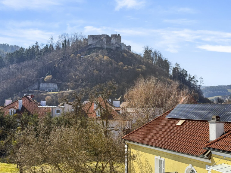 Angrenzend befindet sich ein Durchgangszimmer, das sich flexibel nutzen lässt. Ob als Homeoffice, Ankleideraum oder zusätzlicher Stauraum - dieser Raum lässt sich an unterschiedliche Lebenssituationen anpassen. Von hier aus gelangt man weiter in das Schlafzimmer, das einen ruhigen Rückzugsort innerhalb der Wohnung darstellt. Besonders schön ist hier der Ausblick auf die Burgruine Kirchschlag, der dem Raum eine besondere Atmosphäre verleiht.