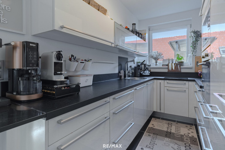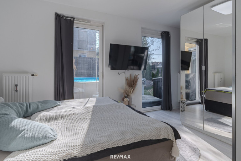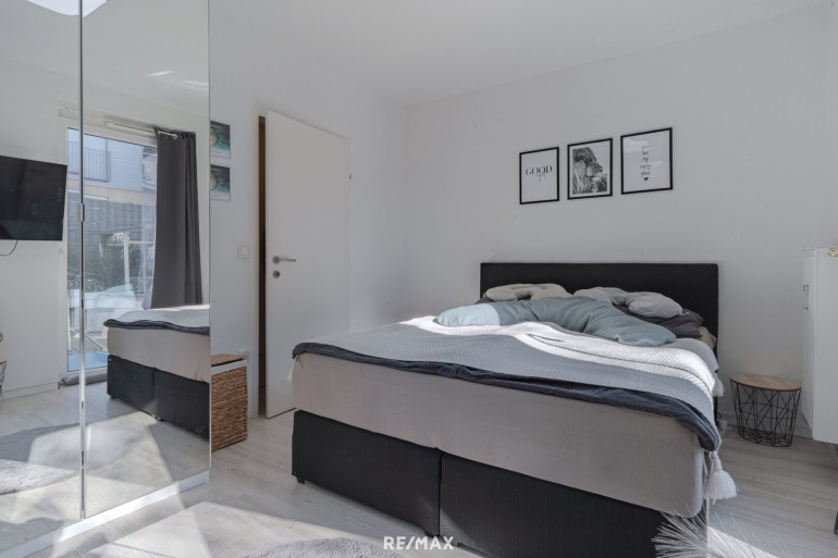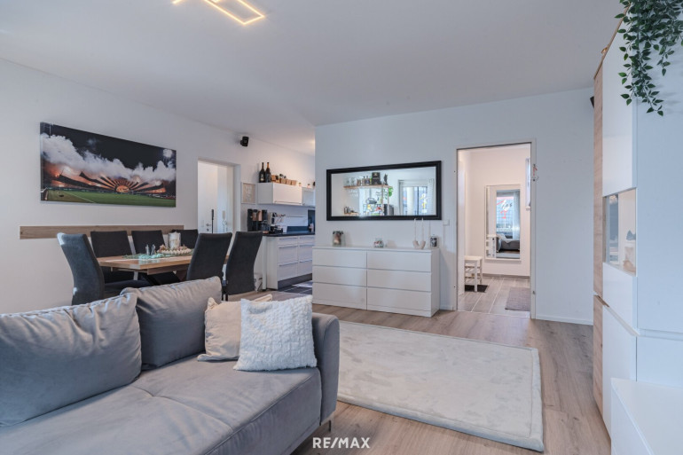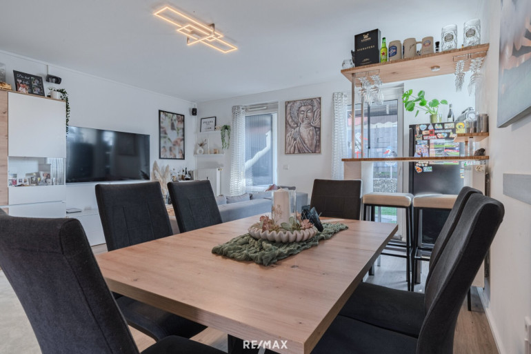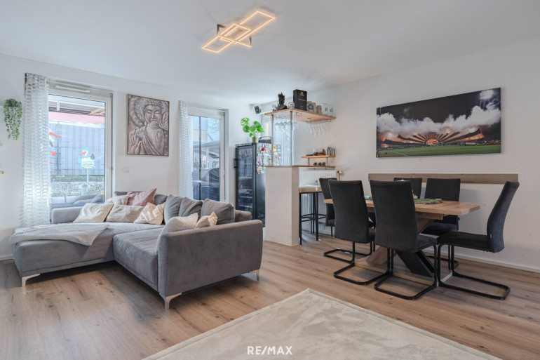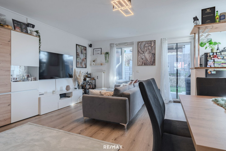 Der Mittelpunkt der Wohnung ist der helle Wohn- und Essbereich mit Küche, der direkten Zugang zur Terrasse und zum Garten bietet. Durch die Südwest-Ausrichtung genießen Sie hier besonders viele Sonnenstunden. Der Garten erweitert den Wohnraum auf natürliche Weise und schafft einen Ort, an dem sich Alltag und Freizeit ideal verbinden lassen.