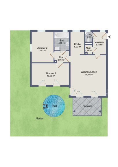3-Zimmer Gartenwohnung mit Südwest-Ausrichtung, Pool und Carport
