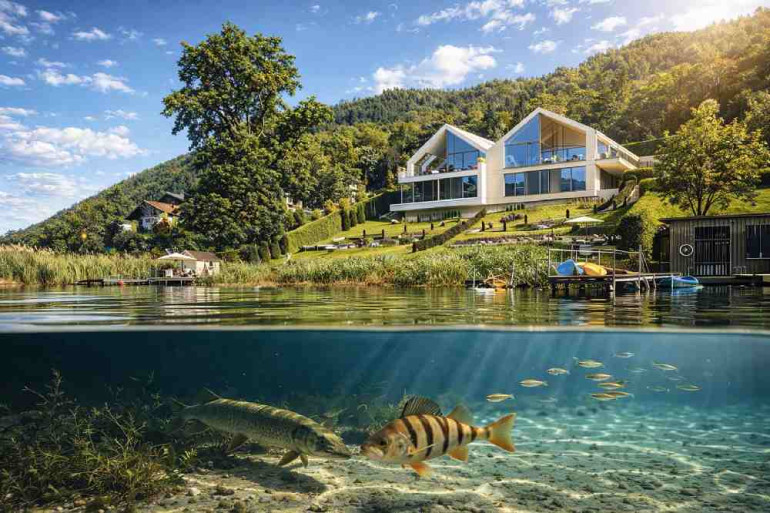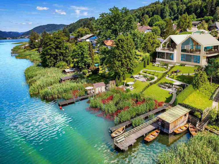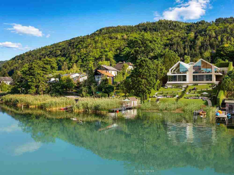 Die moderne Architektur setzt klare Linien, große Offenheit und maximale Naturnähe in Szene. Riesige Glasflächen durchfluten die Räume mit Licht und holen den See sowie den Skiberg Gerlitzen direkt ins Haus. Die großzügigen Terrassen und die Westausrichtung garantieren traumhafte Sonnenuntergänge und unvergessliche Abende im Freien.