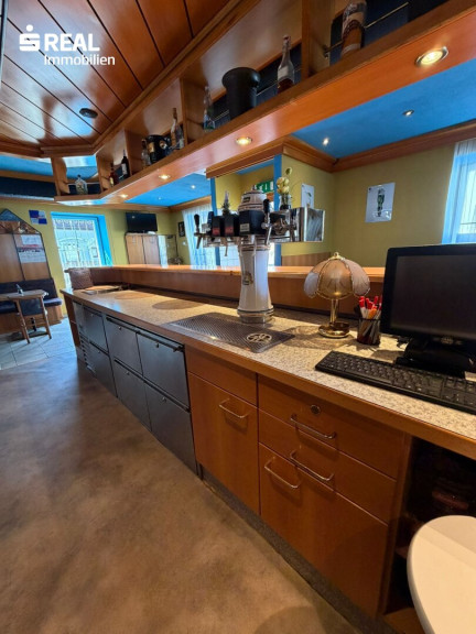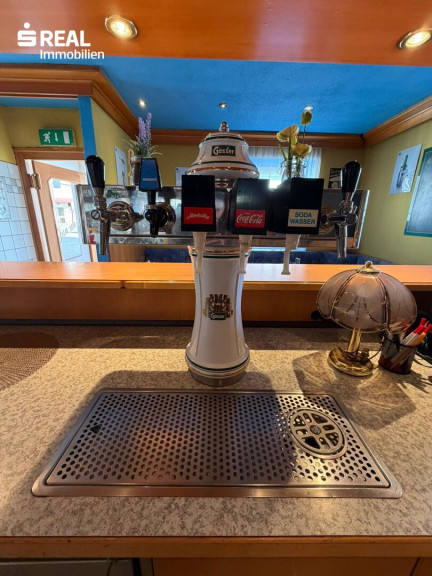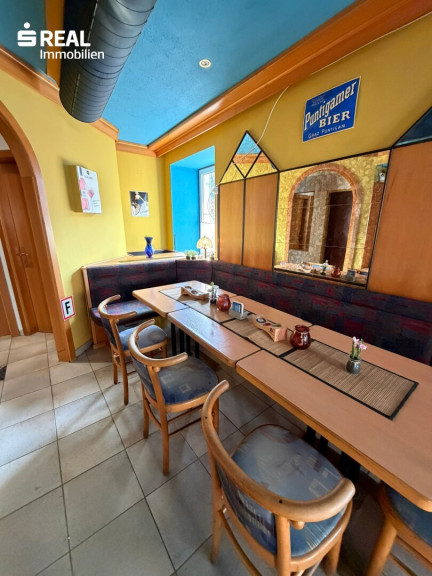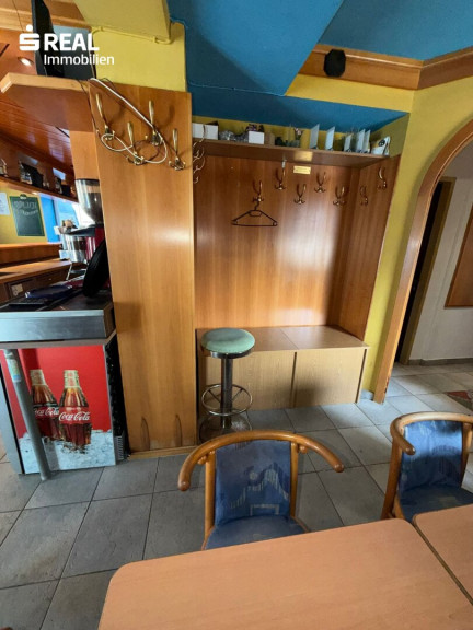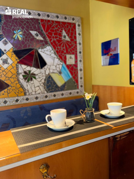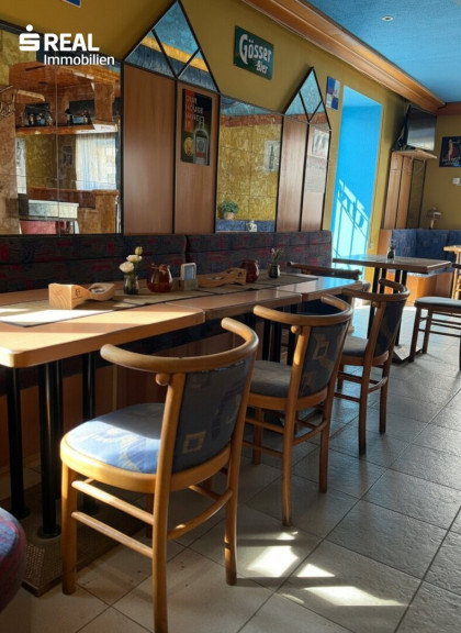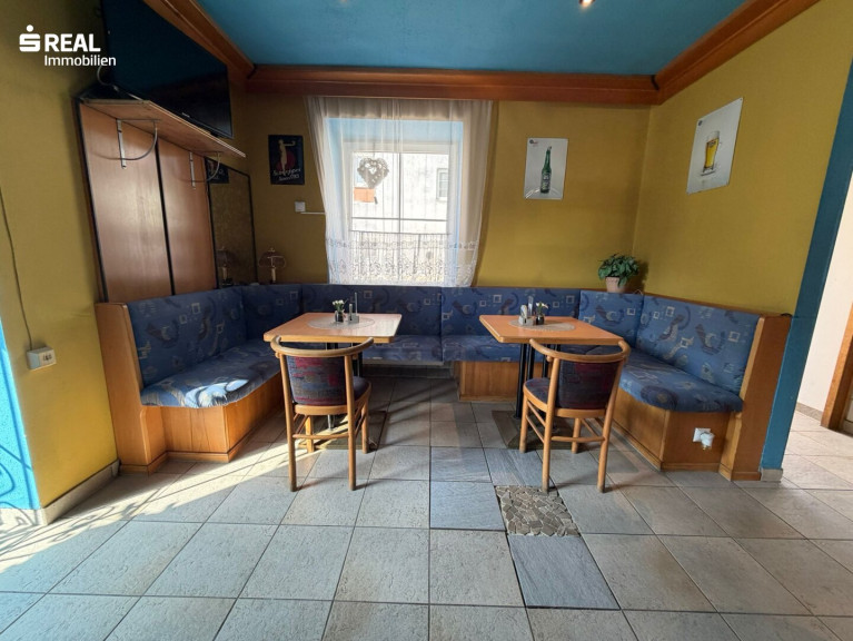 Der offene Gastraum bildet den zentralen Bereich des Lokals und schafft eine angenehme Atmosphäre für Gäste oder Kunden. Ergänzt wird dieser durch eine Schanktheke, eine kleine Küche sowie getrennte Damen- und Herren-WC-Anlagen.