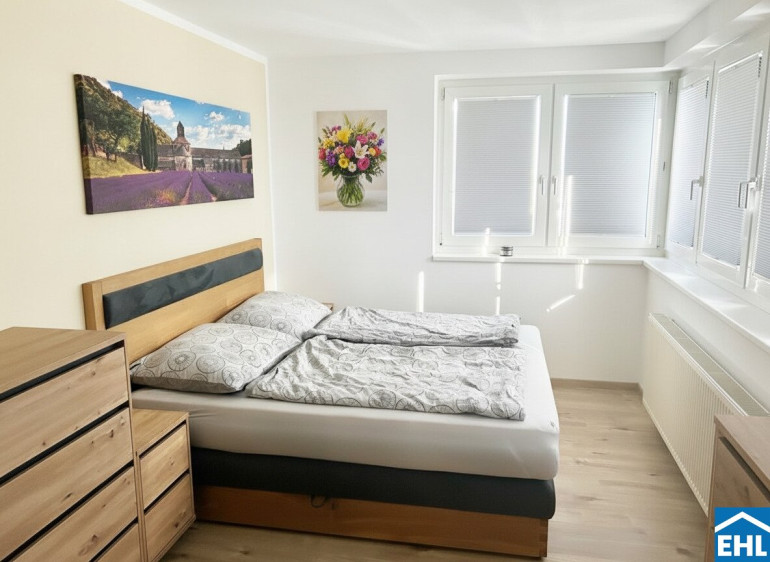 Das Schlafzimmer bietet einen ruhigen Rückzugsort in der Wohnung und ist gut abgetrennt vom Wohnzimmer untergebracht. Ergänzt wird die Wohnung durch ein modern renoviertes Badezimmer mit Dusche und Waschmaschinenanschluss, ein separates WC sowie einen praktischen Vorraum.