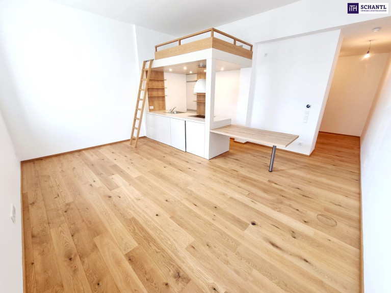 Ihre neue Wohnung wird Sie restlos begeistern und teilt sich in einen geräumigen Vorraum mit Platz für eine Garderobe und eine perfekten Bereich, den man als Stauraum/Schrankraum nutzen kann, ein stylisches Badezimmer mit Dusche und WC, einen praktischen Abstellraum mit Waschmaschinenanschluss und Luftwärmepumpe, sowie ein heller großer Wohn-Essbereich mit voll ausgestatteter Einbauküche und einem raffiniertem Schlafplatz nahe den Sternen...
