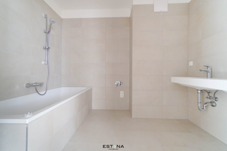 - Badezimmer mit Badewanne, Doppelwaschbecken und Waschmaschinenanschluss