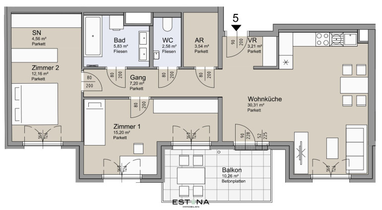 Die angeführten Fotos sind Beispielbilder einer bereits fertiggestellten Wohnung oder KI Visualisierung im Projekt.