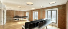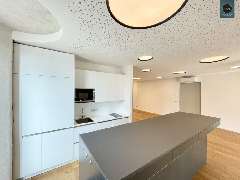- 1 Großer Raum, ideal als Foyer, Empfangsbereich oder Open-Office inkl. äußert hochwertiger Einbauküche (inkl. Mikrowelle, Kühlschrank, Geschirrspüler, Induktions-Kochfeld) samt Kücheninsel