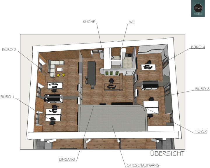 Die auf den Fotos teilweise abgebildeten Büromöbel sind nicht inkludiert.