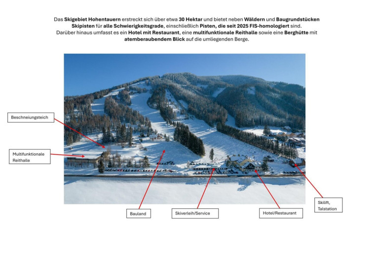 Das Skigebiet erstreckt sich über ca. 30 ha und umfasst neben Wald, Wasserquellen, einem Beschneiungsteich, 5 Schleppliften, 11 km Skipisten mit allen Schwierigkeitsgraden - die Skirennpisten sind seit 2025 FIS-homologiert und Baugrundstücken auch ein Sporthotel mit Restaurant und Terrasse, eine multifunktionale Reithalle, ein Nebengebäude mit Sportartikelverleih und Garagen, vier großen Parkflächen sowie eine Berghütte in 1800 m Seehöhe!