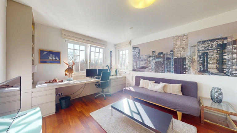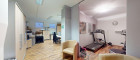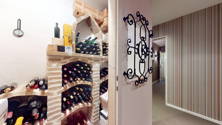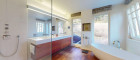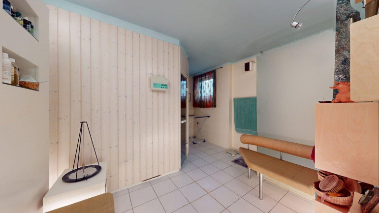 Fliesen, Parkett, Erdwärme, Fußbodenheizung, Einbauküche, Südbalkon, Bad mit Fenster, Badewanne, Dusche, Garage, Alarmanlage, Sauna, Swimmingpool, Wasch/Trockenraum