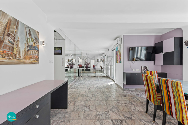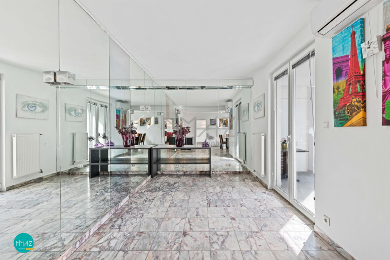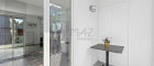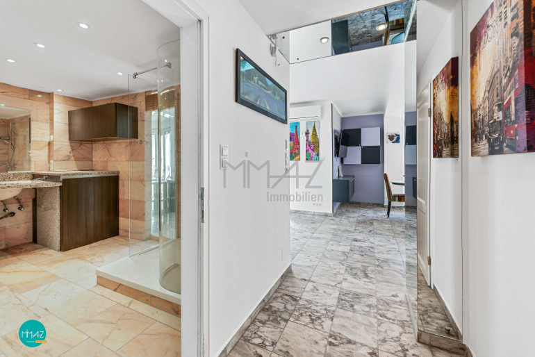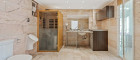 Ein weiterer Hingucker: das großzügige Wellness-Badezimmer im eleganten Rosa-Marmor-Design, ausgestattet mit Dusche, WC, Bidet, Waschmaschinenanschluss und einer Infrarotkabine.