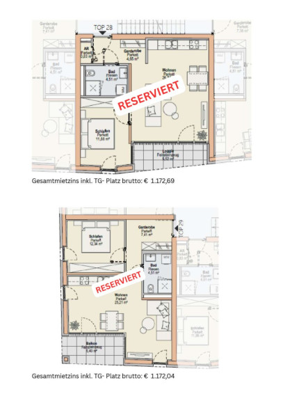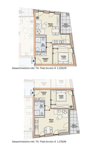 Der monatliche Gesamtmietzins beinhaltet die Miete für die jeweilige Wohnung und den zugehörigen Tiefgaragen- oder Außenabstellplatz sowie Betriebs- und Heizkosten.