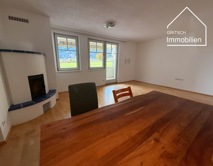 Die rund 84 m² große 3-Zimmerwohnung überzeugt durch ihre freundliche Raumaufteilung, großzügigen Wohnbereich mit Holzofen, eine separate Küche sowie den Zugang zur überdachten West-Loggia – perfekt für entspannte Sonnenstunden und Abende mit Aussicht.