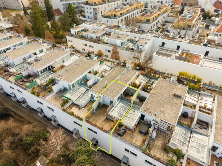 Zum Verkauf steht dieses außergewöhnliche Atriumreihenhaus mit rund 130 m² Wohnfläche und zwei Terrassen. Das Reihenhaus ist Teil einer exklusiven Wohnanlage mit 42 Einheiten, die 1999 vom renommierten Architekten Walter Stelzhammer konzipiert und von BUWOG errichtet wurde und sich in einer ruhigen Privatstraße befindet.